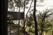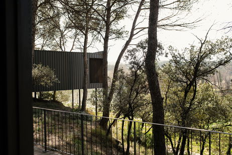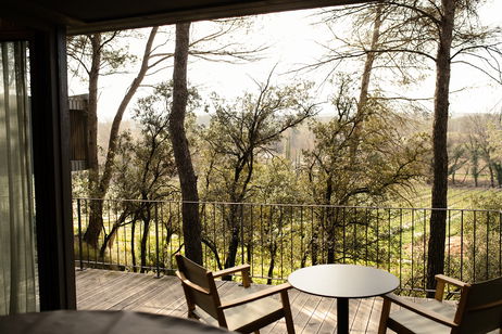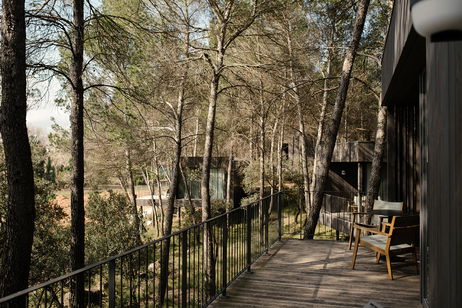 Cabaña de madera sostenible integrada en el bosque, rodeada de árboles y con una terraza exterior con bañera para disfrutar del entorno, la naturaleza y la tranquilidad absoluta.